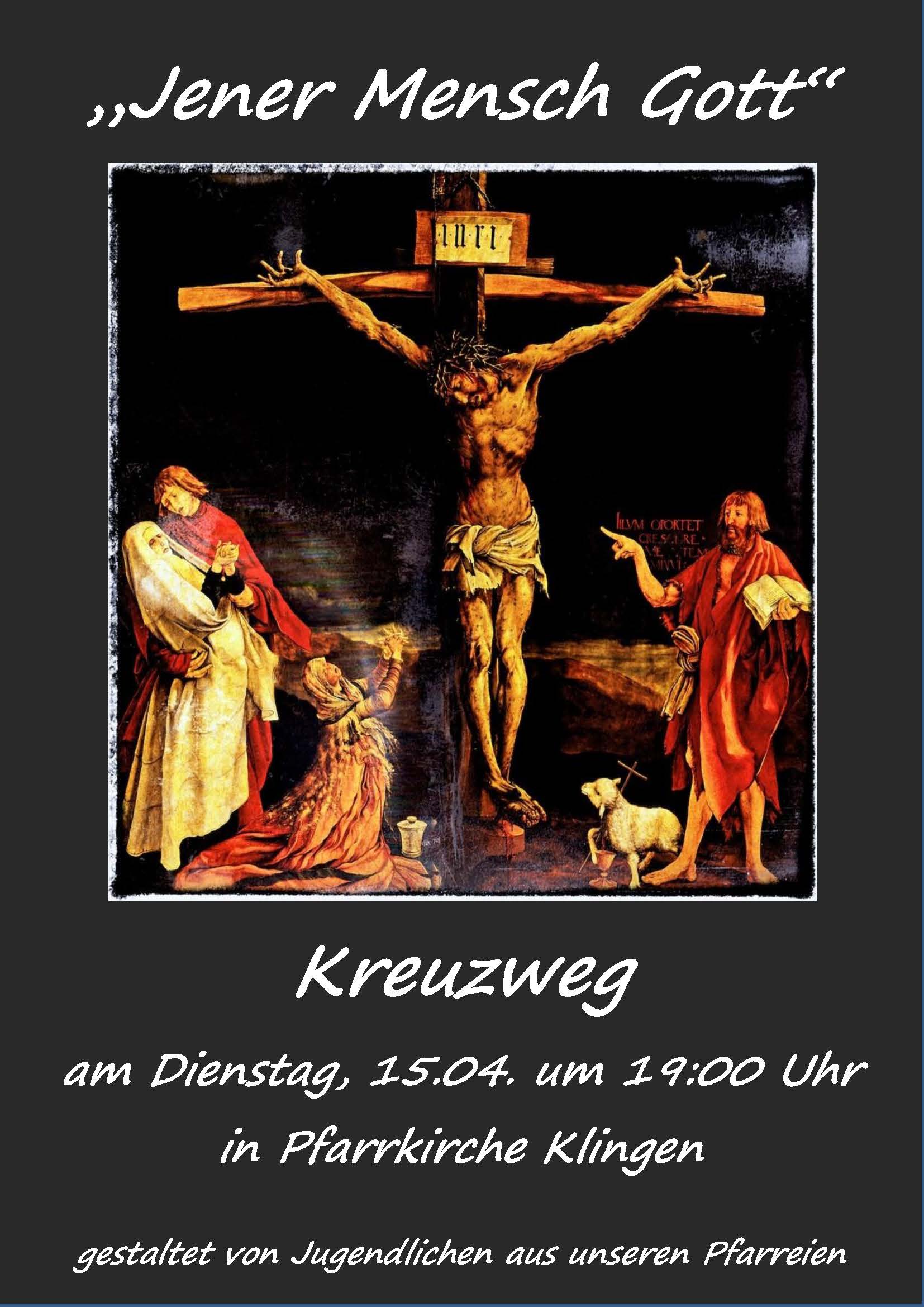 (CP) Unter dem Thema "Jener Mensch Gott" gestalten unsere Ministranten und die Gruppe Talitakum am Dienstag, 15. April um 19:00 Uhr einen Kreuzweg in der Pfarrkirche in Klingen.