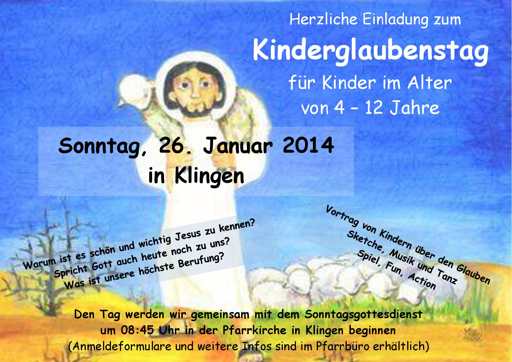 ich lade Euch ganz herzlich zu einem Kinderglaubenstag am Sonntag 26. Januar 2014 von 08:45 bis 16:00 Uhr ins Pfarrheim/Bürgerhaus in Klingen ein.