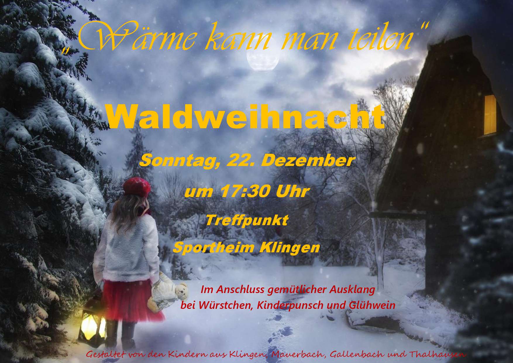 Die Waldweihnacht findet Sonntag, 22. Dezember um 17:30 Uhr in Klingen statt.
