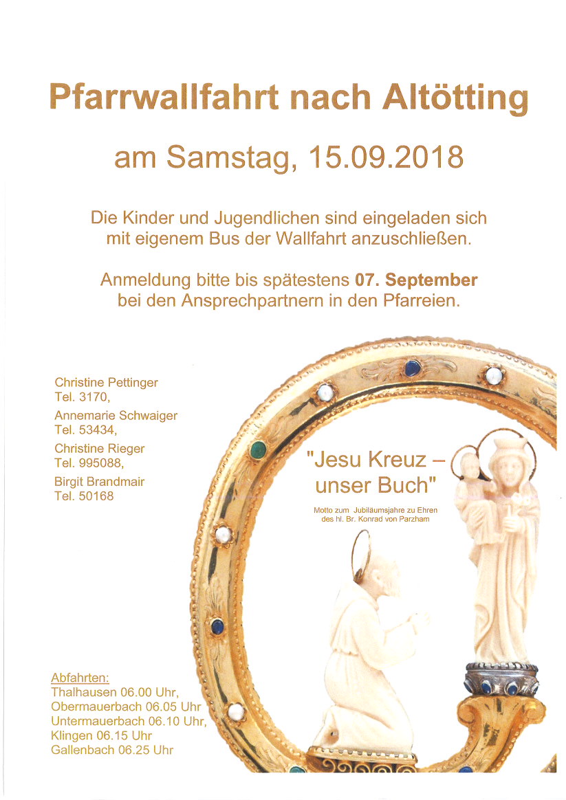 (CP) Unter dem Motto zum Jubiläumsjahre zu Ehren des hl. Br. Konrad von Parzham "Jesu Kreuz – unser Buch", wollen wir uns zu unserer Pfarrwallfahrt auf den Weg nach Altötting machen und laden Sie dazu herzlich ein.