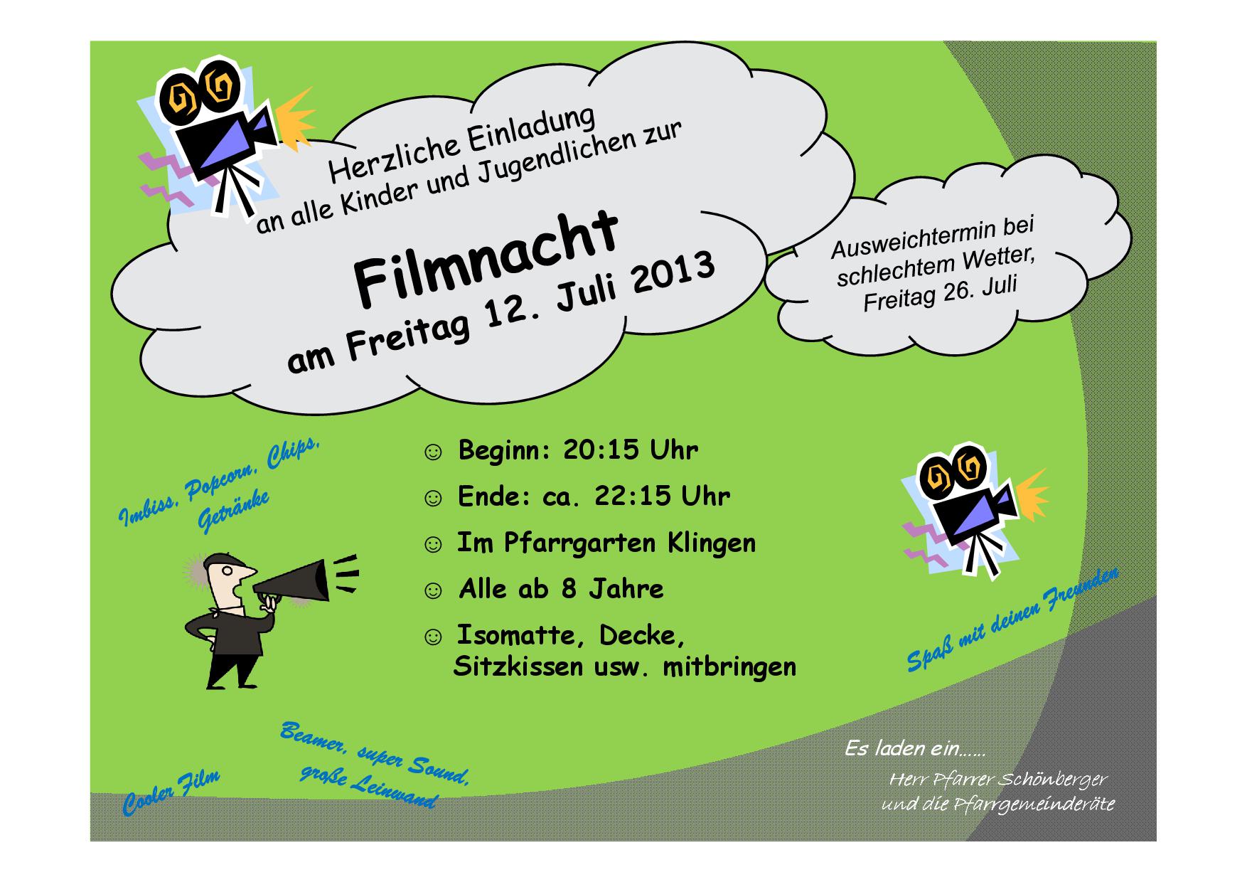 (CP) Herzliche Einladung an alle Kinder (ab 8 Jahren) und Jugendlichen aus unseren drei Pfarreien zur diesjährigen Filmnacht im Pfarrgarten in Klingen.