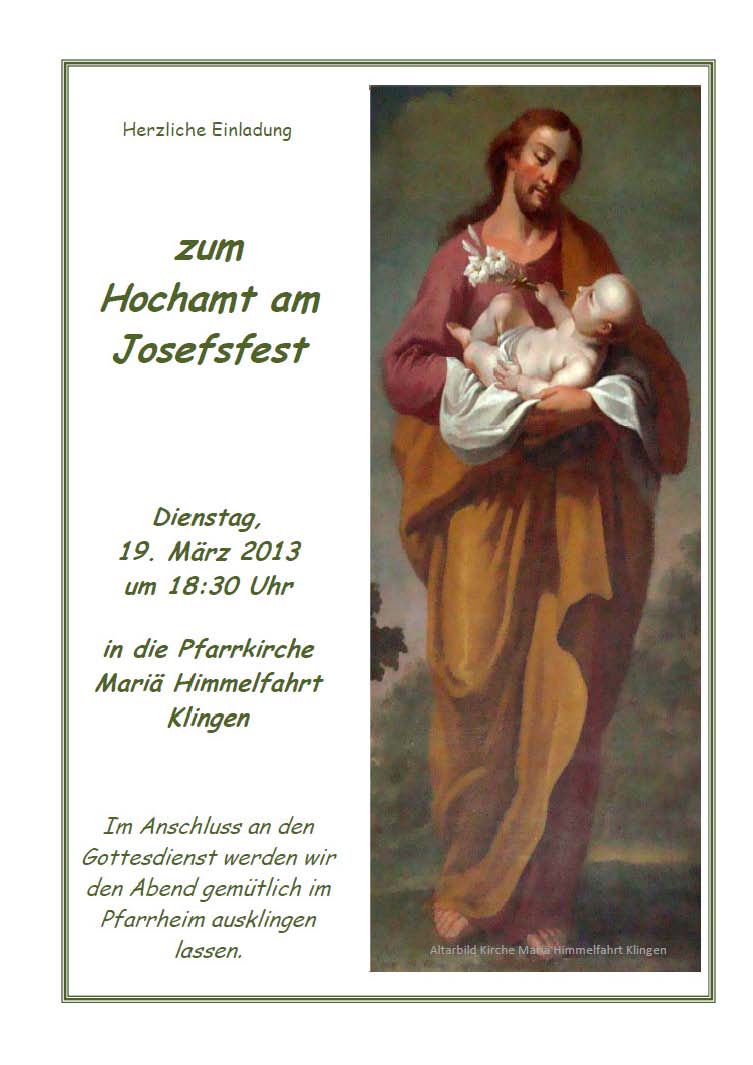 (CP) Herzliche Einladung zum Hochamt am Josefsfest Dienstag,19. März 2013 um 18:30 Uhr in die Pfarrkirche Mariä Himmelfahrt Klingen. Im Anschluss an den Gottesdienst werden wir den Abend gemütlich im Pfarrheim ausklingen lassen. An diesem Tag besteht auch die Möglichkeit zur Aufnahme in die Bruderschaft. Ein Aufnahmeformular finden Sie auf der Homepage im Reiter Josefsbruderschaft. |