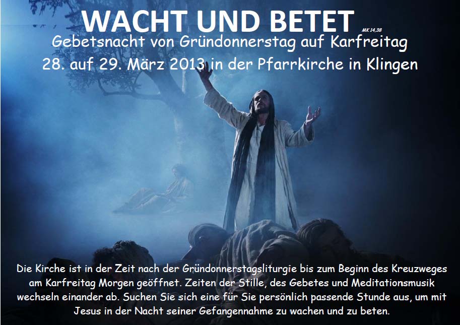 (CP) „Wacht und betet“ (Mt, 26, 41 / Mk 14,38) so forderte Jesus seinerzeit die Jünger im Garten Getsemani auf. Auch wir wollen dieser Aufforderung nachkommen und von Gründonnerstag, 23. März 2013 auf Karfreitag, 24. März 2013 in der Pfarrkirche in Klingen eine Gebetswache abhalten. Aus unseren drei Pfarreien (siehe Zeitplan) sind zu jeder Stunde Beterinnen bzw. Beter anwesend, die sicherstellen, dass die ganze Nacht hindurch jemand am Allerheiligsten wacht.