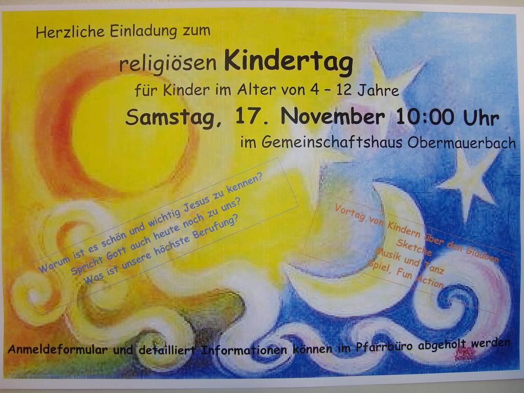 ich lade Euch alle ganz herzlich zu einem Kindertag am Samstag 17. November 2012 von 10:00 bis 17:00 Uhr ins Gemeinschaftshaus Obermauerbach ein.