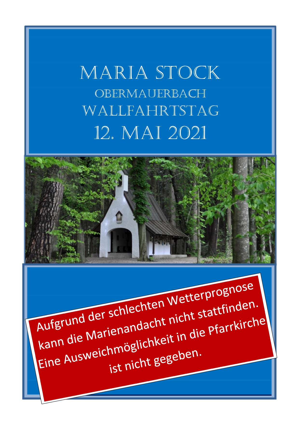 (CP) Aufgrund der schlechten Wetterprognose kann die Marienandacht morgen leider nicht stattfinden. Eine Ausweichmöglichkeit in die Pfarrkirche ist nicht gegeben. |